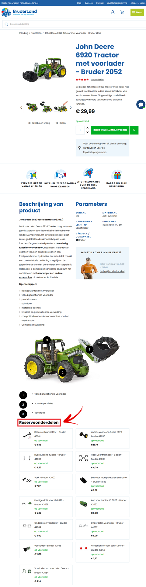 2. Onder de productbeschrijving (of onder de video/foto van het product) vind je de sectie met reserveonderdelen.