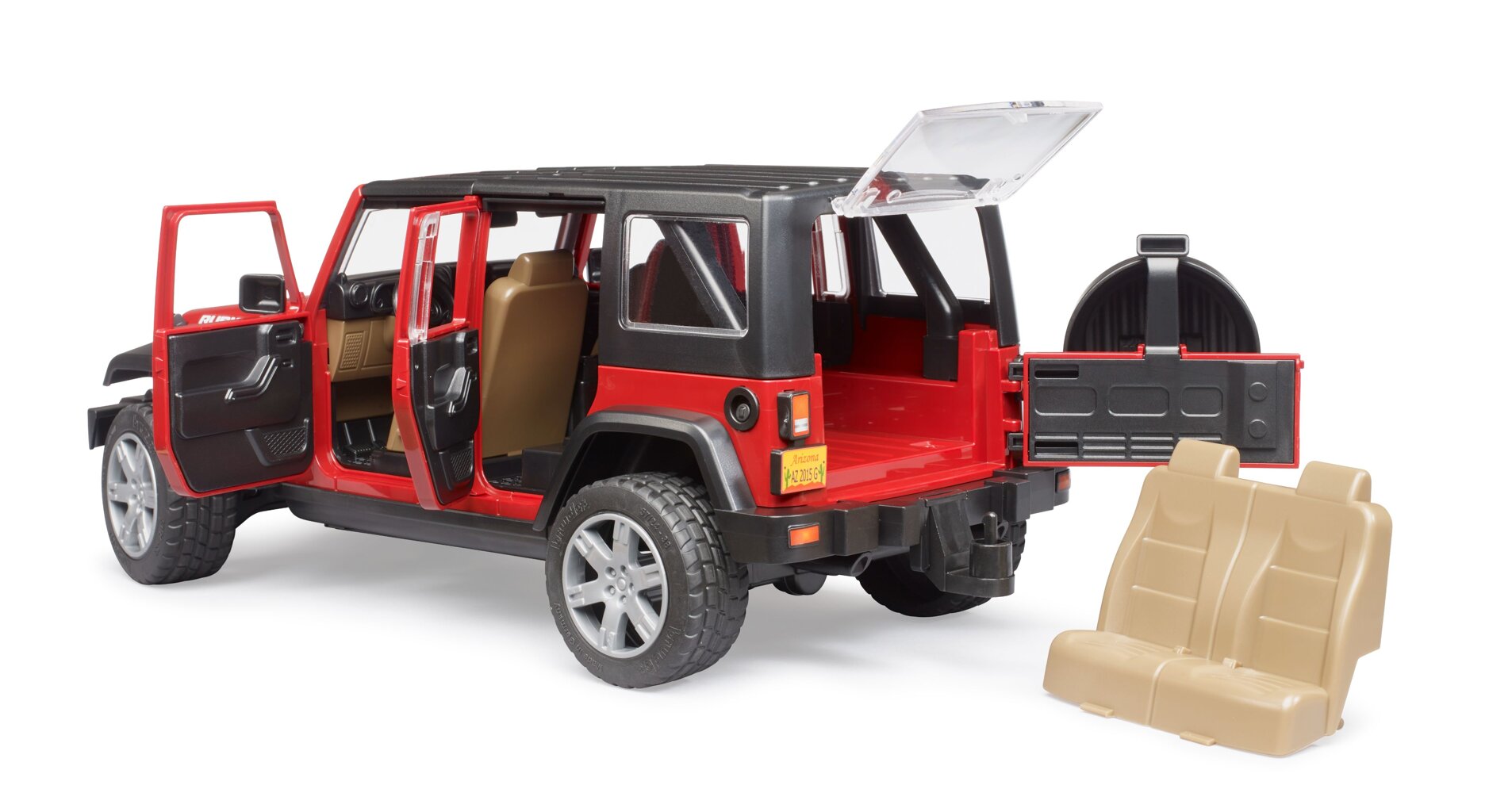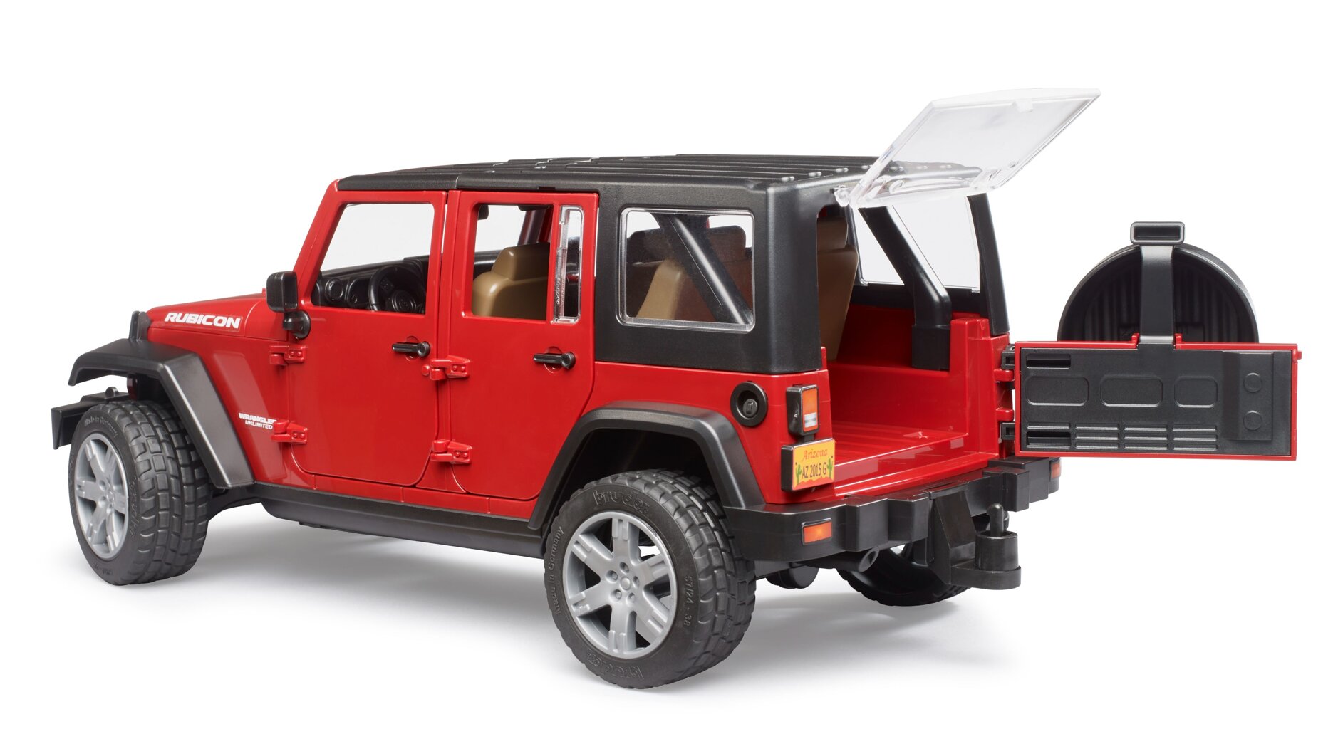 Het luxe off-roadmodel Jeep Wrangler Rubicon zal de ogen van elke jongen doen oplichten. Dit model valt op door zijn zeer gedetailleerde en hoogwaardige afwerking, het is geproduceerd in de schaal 1:16. Naast zijn geweldige uiterlijk overtuigt hij ook met leuke features: hij kan worden bestuurd met een verlengd stuur , alle deuren kunnen worden geopend en hij beschikt bovendien over een trekhaak, waardoor er Bruder-aanhangwagens aan kunnen worden gekoppeld. Voor optimaal spelplezier kan het kind maximaal vier figuren uit de Bworld-editie plaatsen.