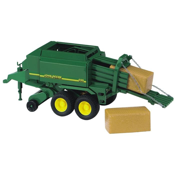 Het gedetailleerde model van de John Deere balenpers is een geweldige aanvulling op de boerderij van uw kind. De balenpers kan aan elke tractor uit de Bruder Profi-editie worden gekoppeld en is tijdens het rijden volledig functioneel: hij beschikt over een aangedreven stroopvangbak en er worden tijdens het rijden twee balen uit de balenpers getransporteerd.