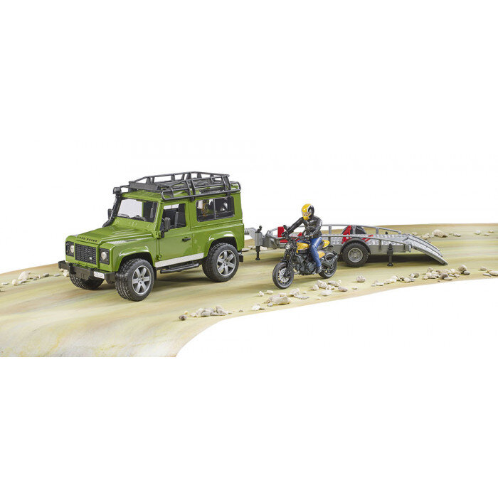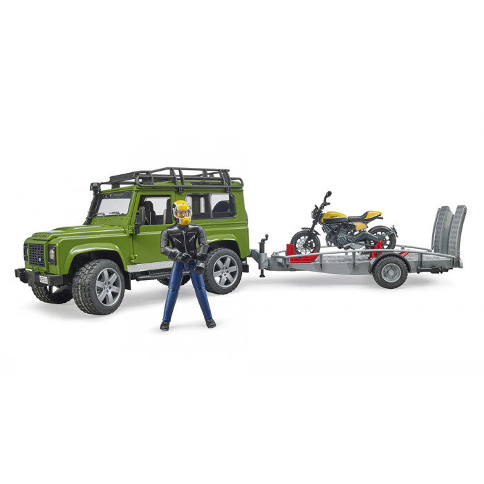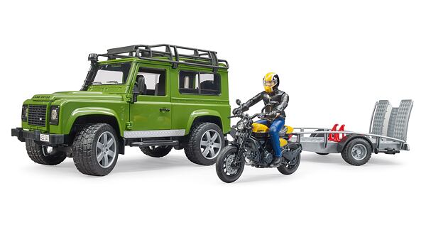 Land Rover met transporter en Ducati Scrambler Full Throttle motorfiets - Bruder 2589