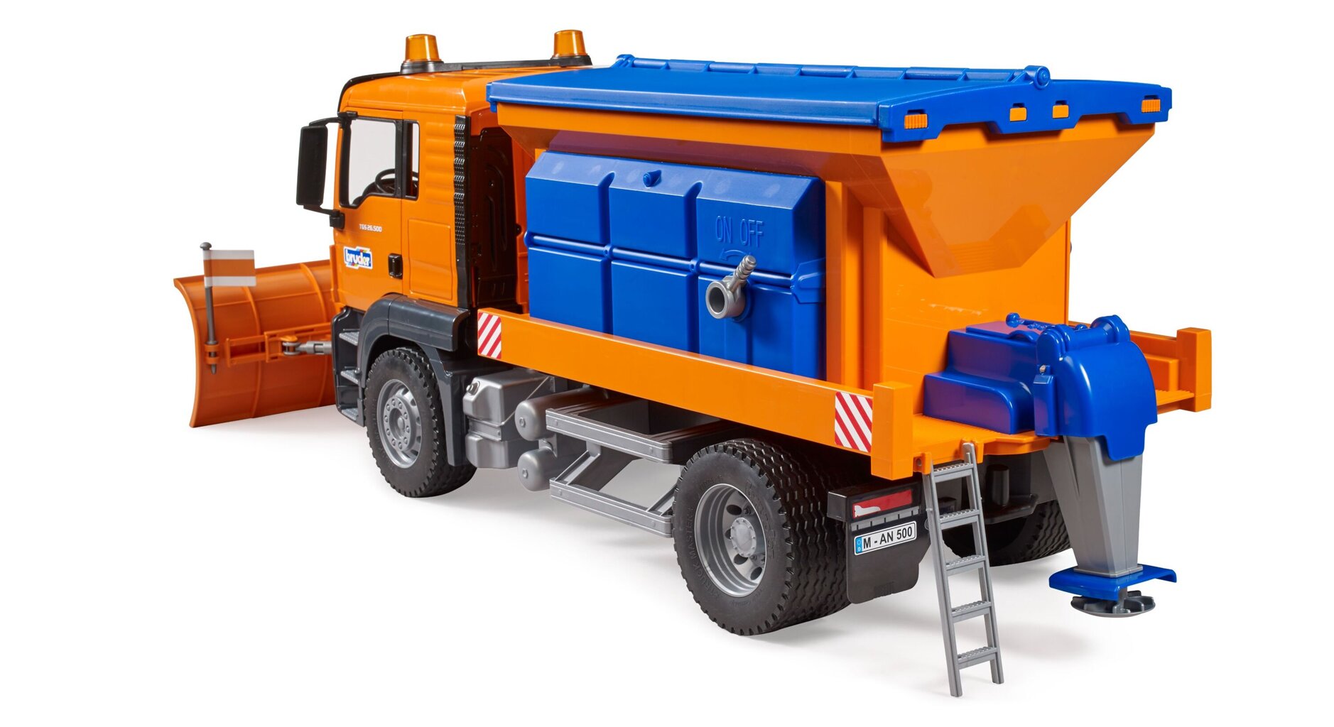 Het brede, in hoogte verstelbare en afneembare blad kan zelfs de dikste sneeuw ruimen en zo een verkeersgeschikte ondergrond creëren. Een uiterst realistisch sproeimechanisme brengt zand of andere strooisels op het wegdek aan om verlies van controle over het voertuig te voorkomen. Je zult veel plezier beleven aan deze truck, of hij nu buiten of binnen staat. Het model kan worden aangevuld met een zwaailicht met licht en sirene ( Bruder 2801 ).