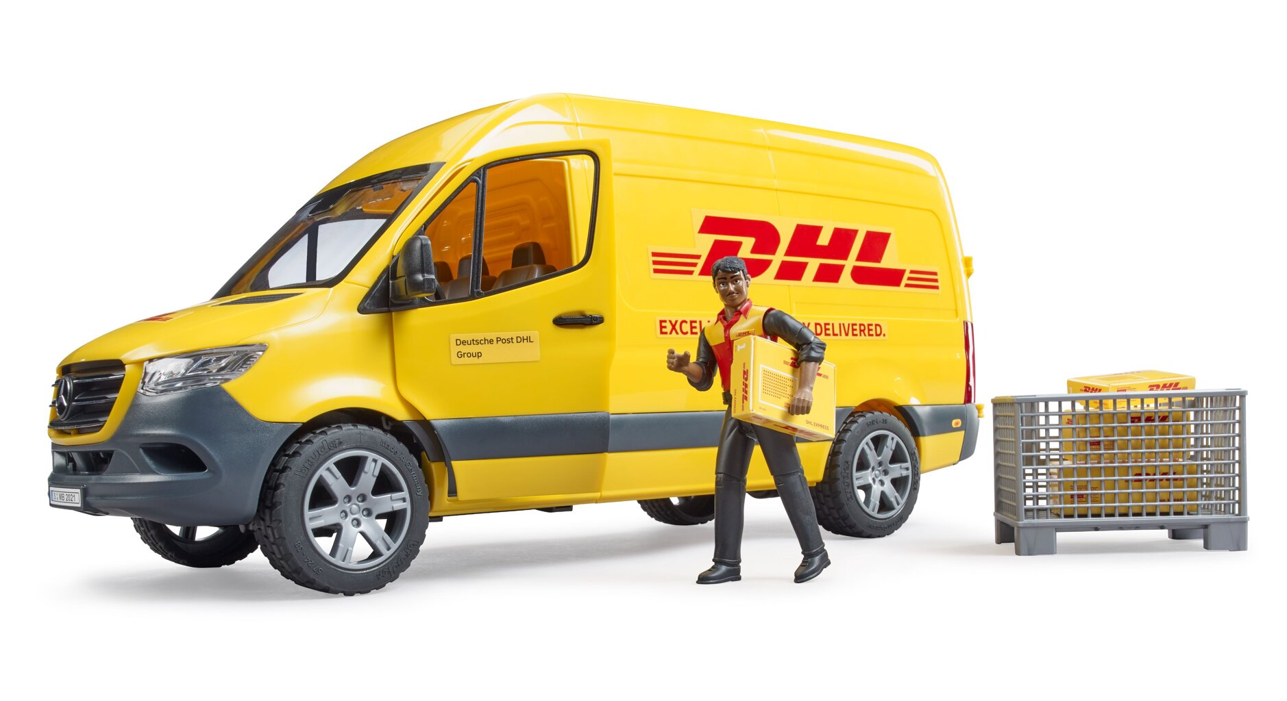 Het voertuig heeft openslaande deuren in de bestuurderscabine en achterin. Bijzonder is de nieuw ontwikkelde schuifdeur aan de passagierszijde. Het model is voorzien van een DHL chauffeur, gitaarkist en DHL verzenddozen. Dankzij het uitgebreide logistieke programma kan dit geweldige model verder worden uitgebreid met de logistieke kit (Bruder 2415) en de Linde H30D vorkheftruck (Bruder 2511) , die voor nog meer speelplezier zorgen.