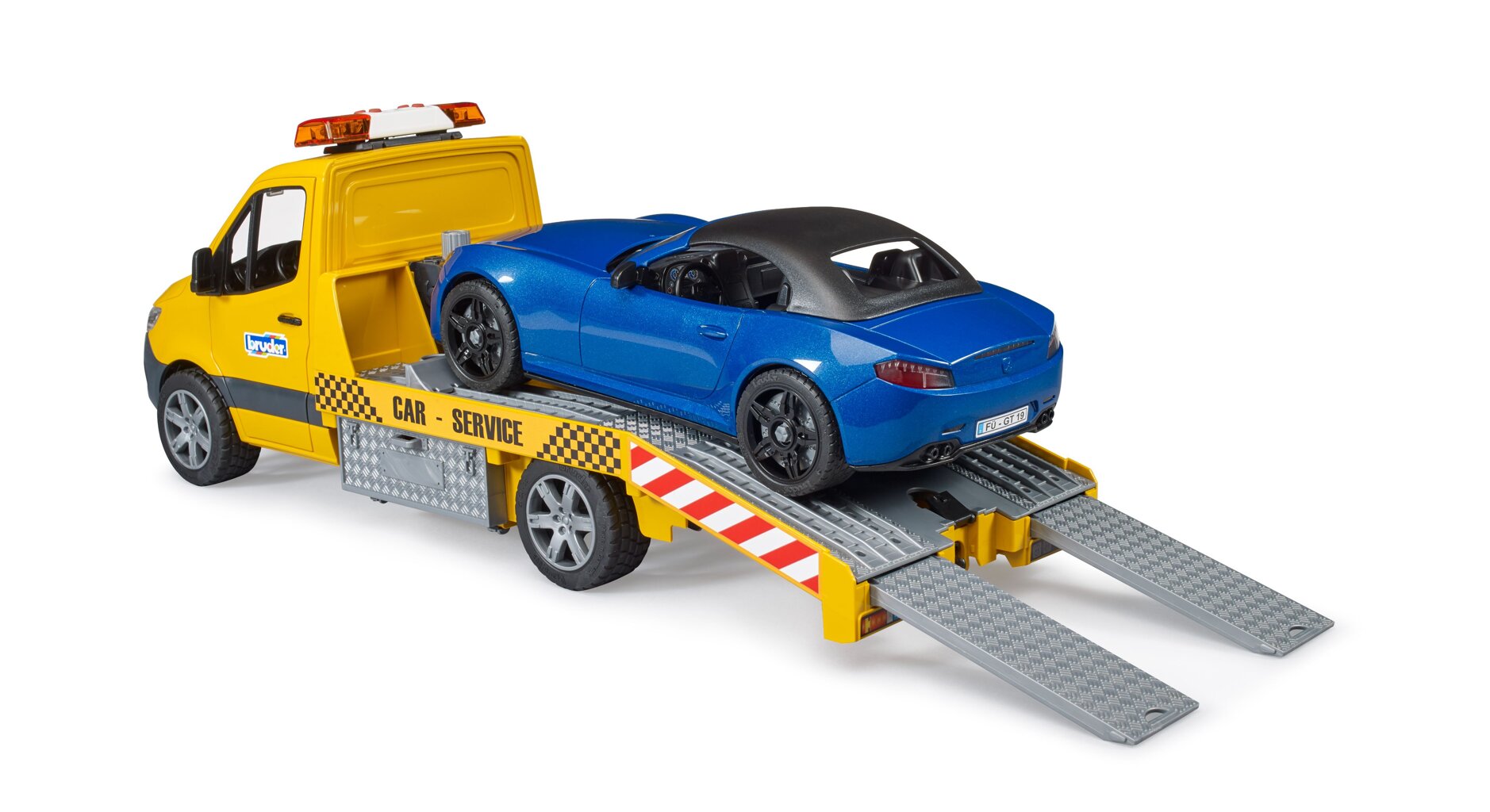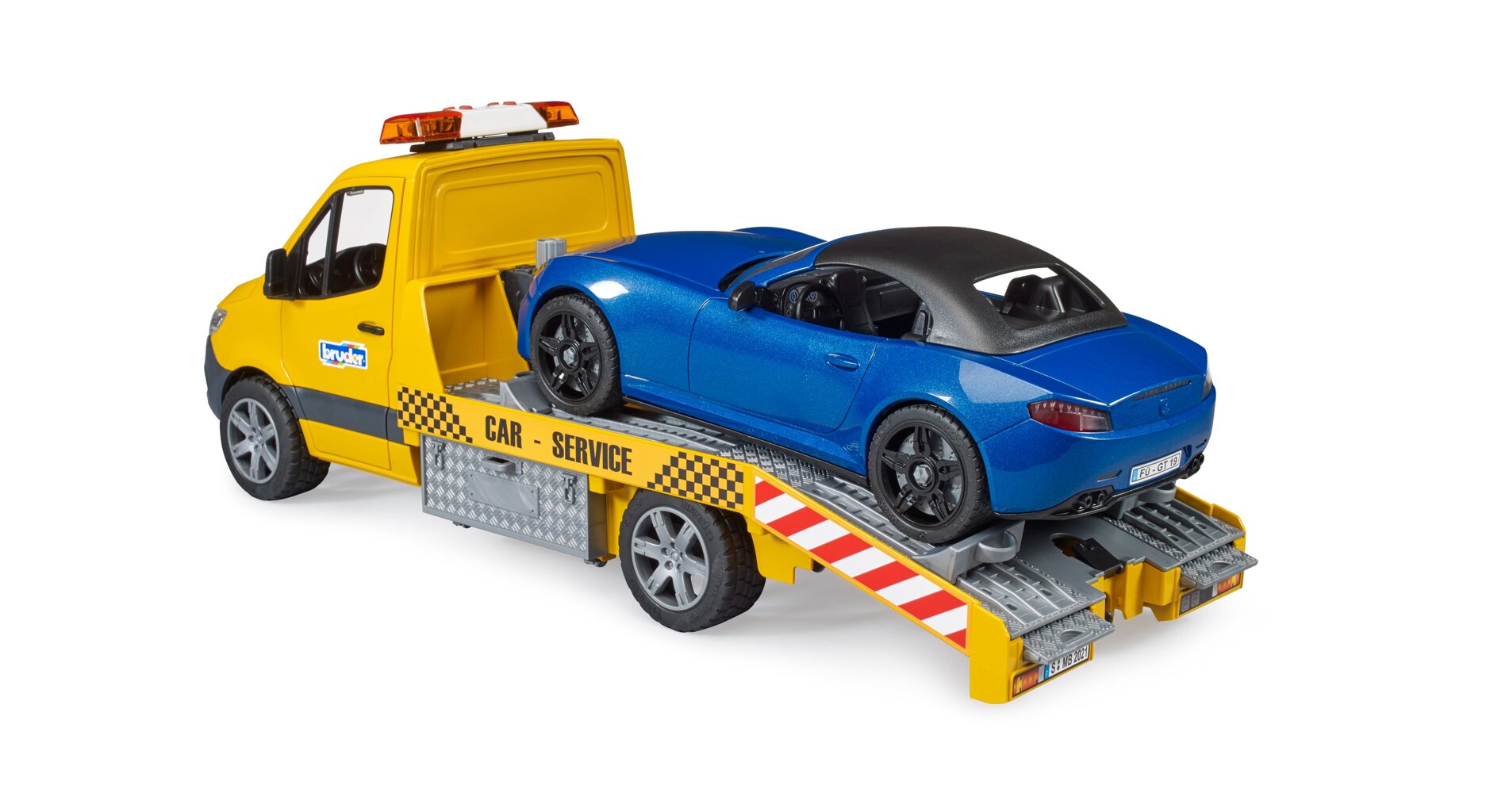 Het stijlvolle en moderne design van de autotransporter valt op het eerste gezicht op. De autosleepwagen heeft een platform dat net als het origineel tot in het kleinste detail is gemodelleerd. Naast de hoogwaardige deuren met binnenbekleding en de licht- en geluidsmodule is een bijzonder kenmerk de kabellier. Met deze touwlier kunnen kapotte voertuigen zelfs uit de moeilijkste situaties worden bevrijd. Gereedschapskisten aan de zijkant worden gebruikt voor het opbergen van wielkeggen en opritten kunnen ook rechtstreeks in het chassis worden geplaatst. De Roadster heeft een afneembaar dak en biedt plaats aan elk BWORLD Edition-figuur. Voor nog meer speelplezier is het voertuig voorzien van een nieuw wielwisselsysteem. Dit voertuig kan ook worden uitgebreid naar de Bruder 62110 werkplaats.