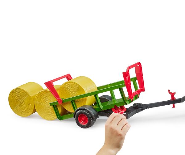 In de moderne landbouw staan snelheid en efficiëntie op het veld centraal - en dat is precies wat de kinderen met de BRUDER rondebalenplukker zullen ervaren. De aanhanger kan aan BRUDER tractoren van de bouwserie 1000 tot 3000 of direct aan de rondebalenpers met de typische BRUDER trekinrichting worden gekoppeld.