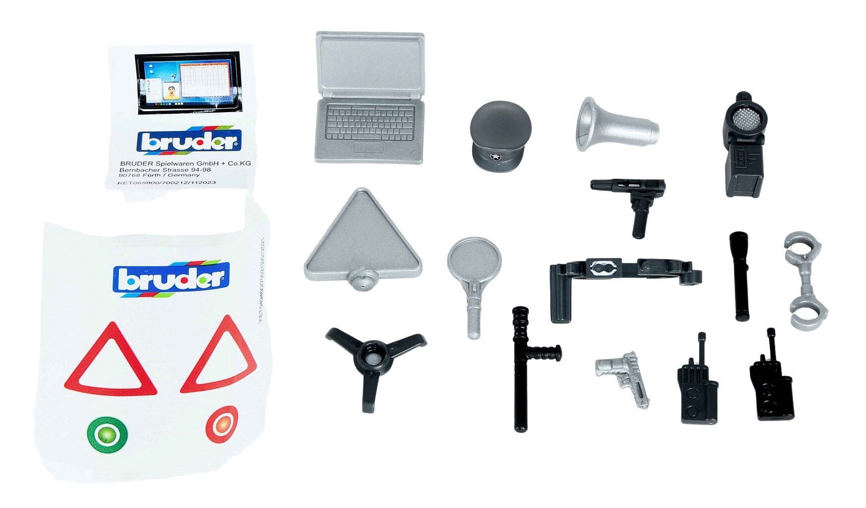 Deze set accessoires is ontworpen voor Bruder politiemodellen. Hij bevat gedetailleerde accessoires die de spelervaring verrijken en de authenticiteit van je politiescenario's vergroten.