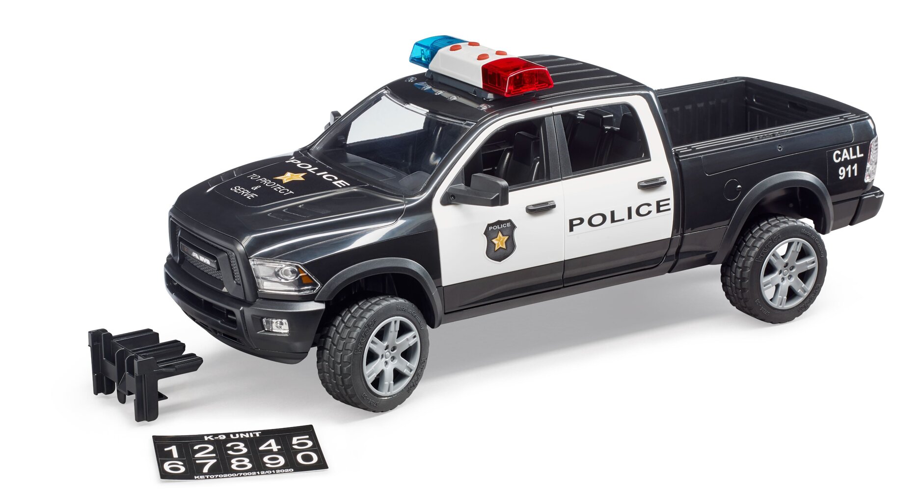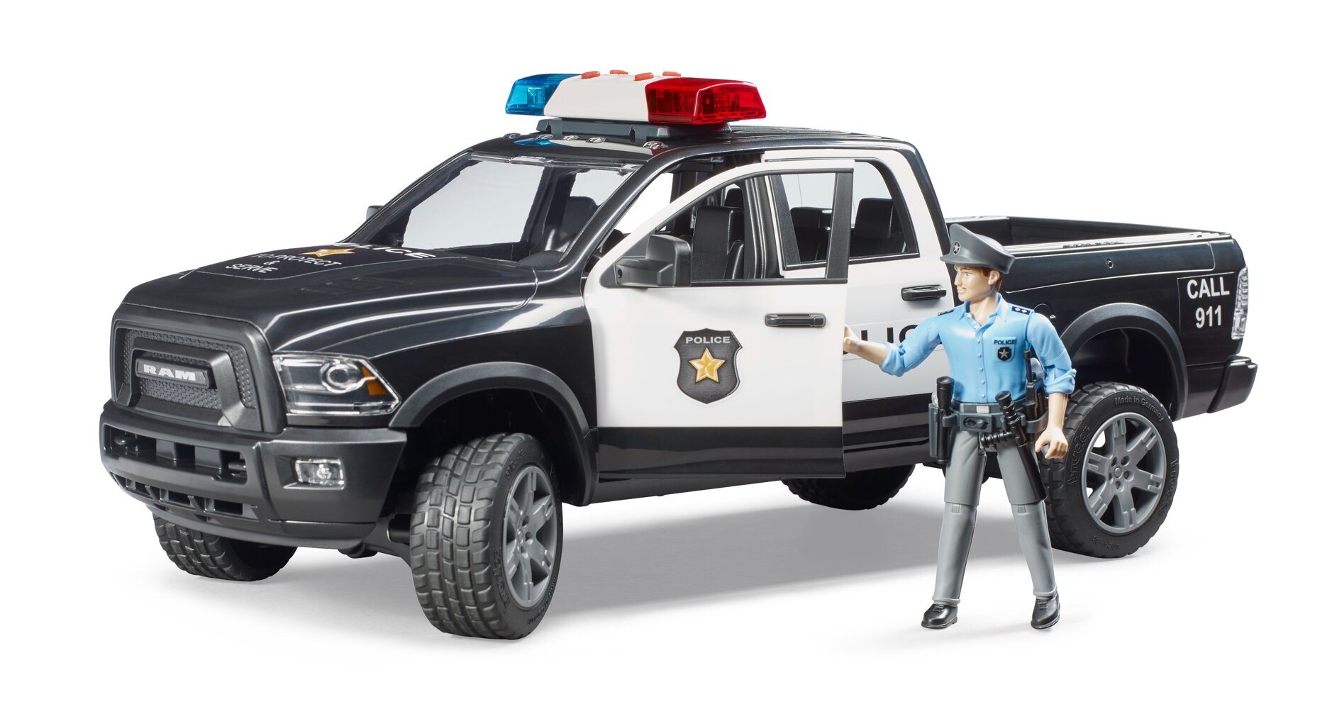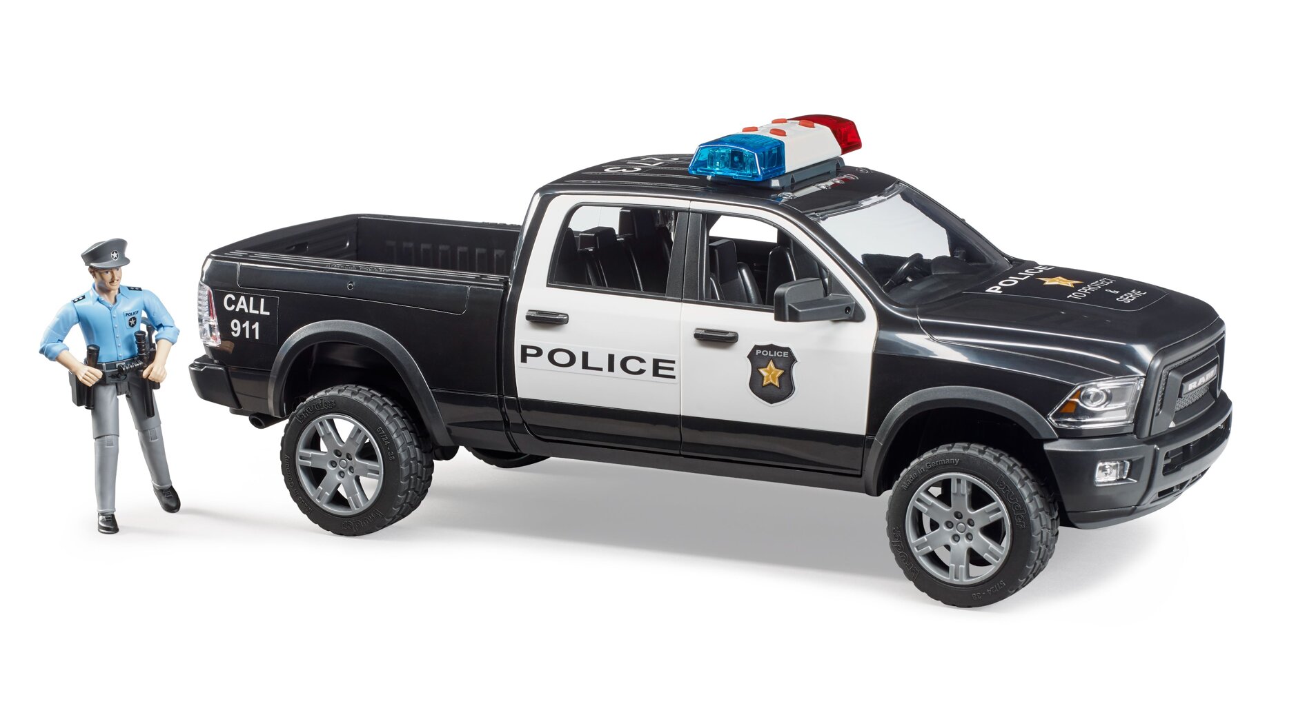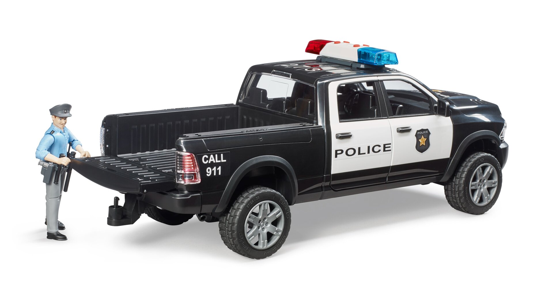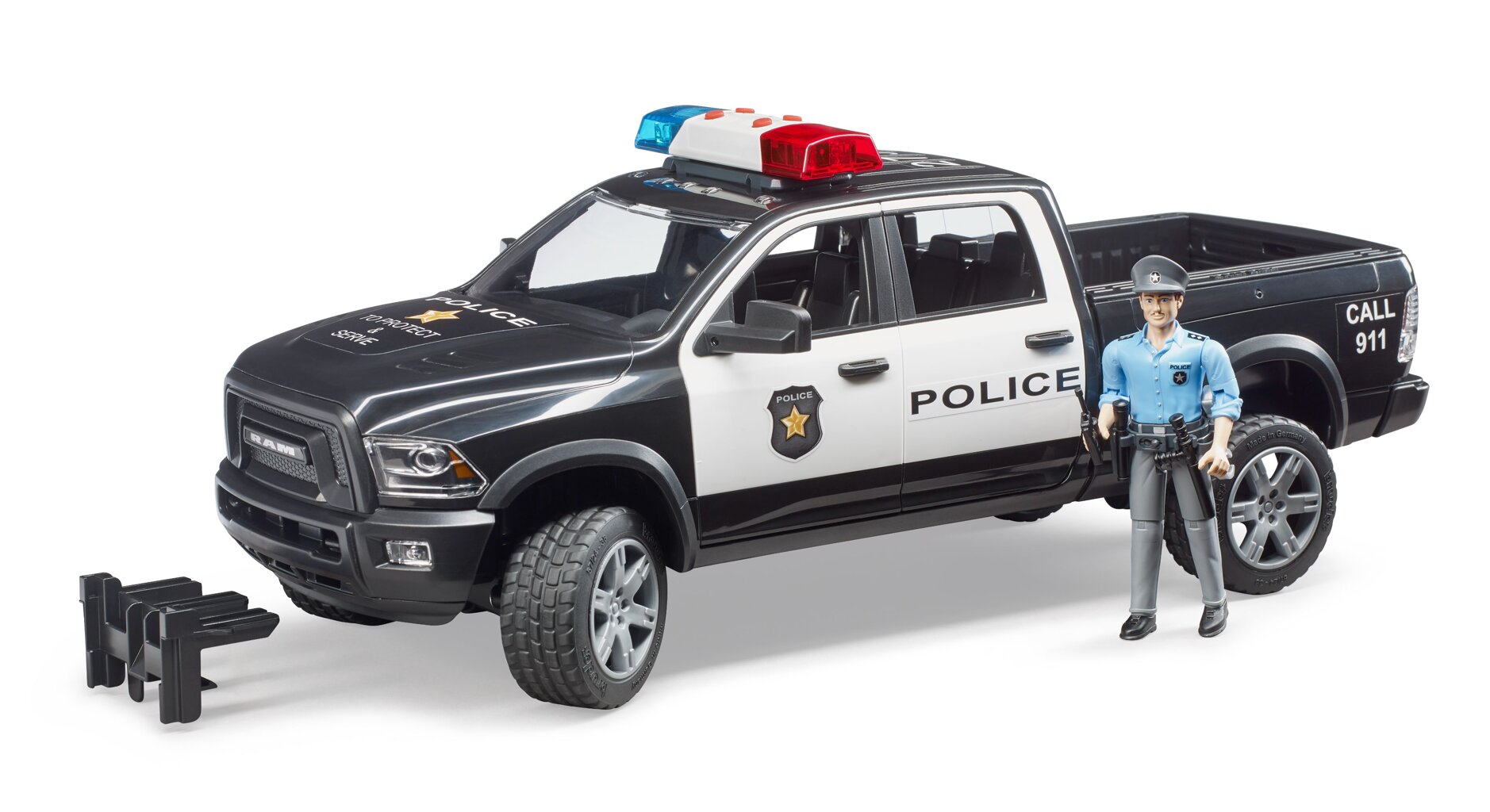 Het hulpverleningsvoertuig is gebaseerd op de auto RAM 2500. Het voertuig is uitgevoerd in politiekleuren en voorzien van een licht- en geluidsmodule. De cabine heeft alle 4 de deuren die open kunnen en biedt plaats aan 4 BWORLD-figuren. De voor- en achteras zijn geveerd en de vooras kan worden bestuurd door middel van een verlengd stuurwiel. Bij de politieauto is ook een politieagentfiguur inbegrepen.
