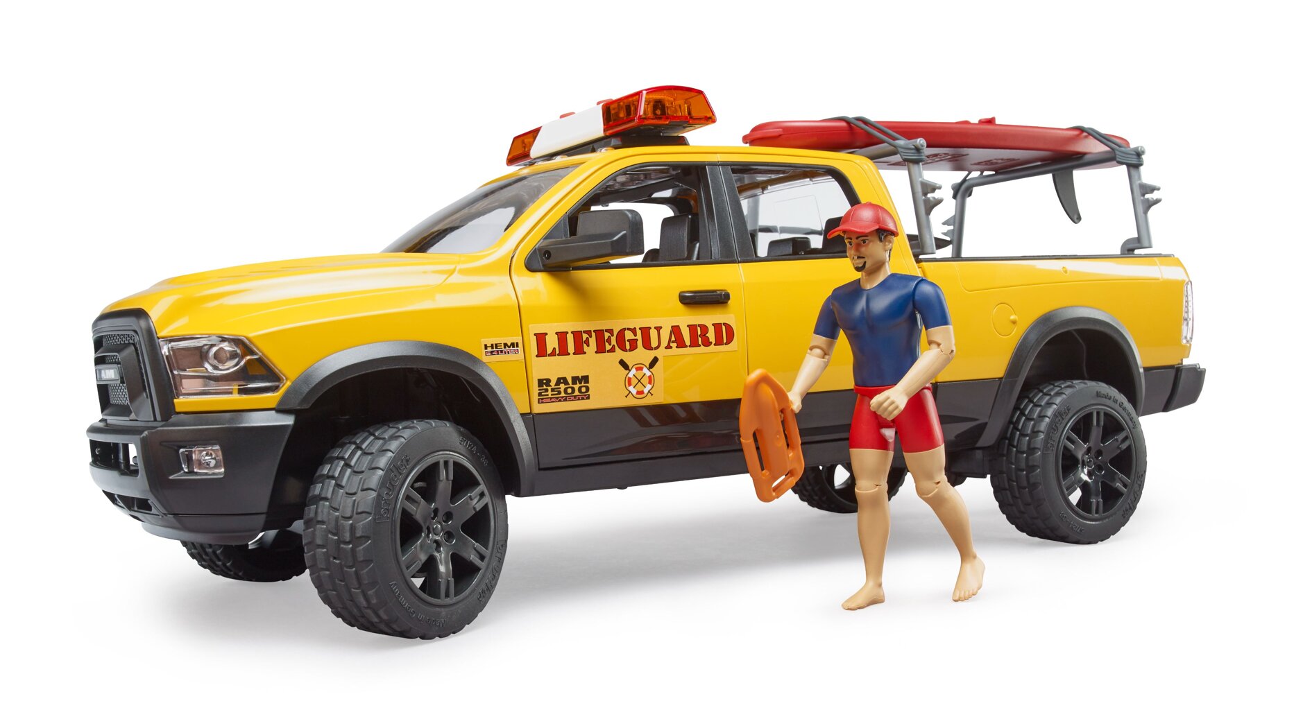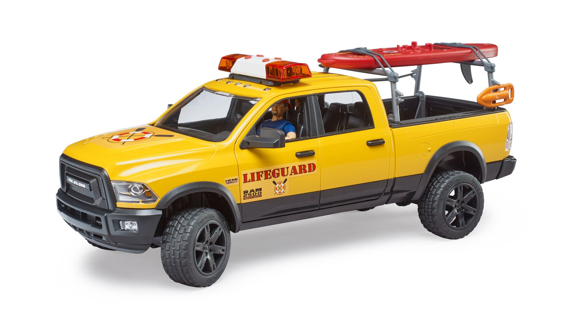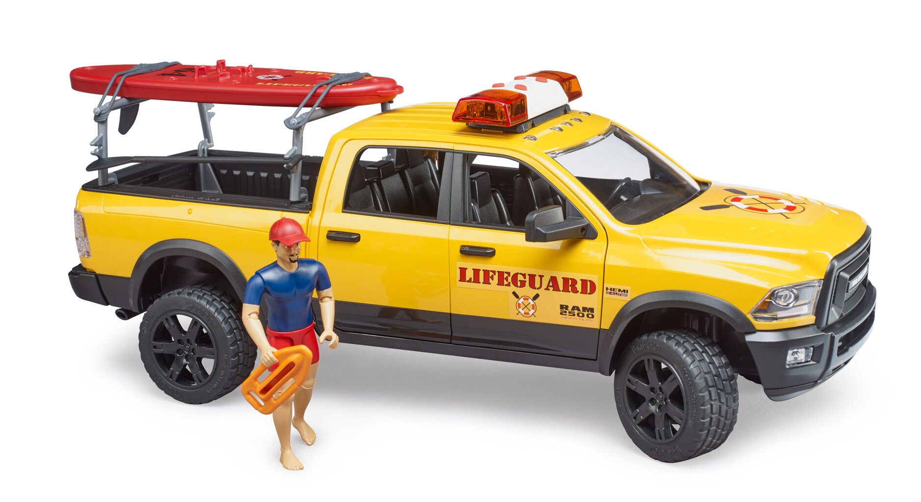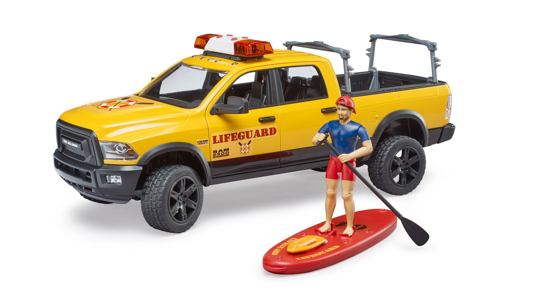 Recreatie en sport op en in het water zijn zeer belangrijke vrijetijdsbestedingen. Vanaf nu is de BWORLD Kustwacht verantwoordelijk voor de veiligheid van alle watersporters met hun RAM 2500 Power Wagon, inclusief Stand Up Paddleboard. De reddingsdienst heeft een sterke partner bij de uitvoering van haar taken. De robuustheid en offroad-capaciteiten van de RAM zijn legendarisch en nog steeds uniek. Ook qua prestaties is deze auto enorm indrukwekkend. De V8 HEMI-motor produceert 410 pk en 582 Nm koppel. Bovendien is de redder uitgerust met een paddleboard. Dankzij hem komt hij snel in elke gevaarlijke situatie op het water terecht. Het sterke drijfvermogen van het board zorgt voor stabiel zwemmen. Als perfecte uitbreiding van het RAM-systeem met een reddingssysteem biedt het nu ook de Bruder 62785 Paddleboard Lifeguard en het Bruder 62780 Coast Guard Rescue Station.