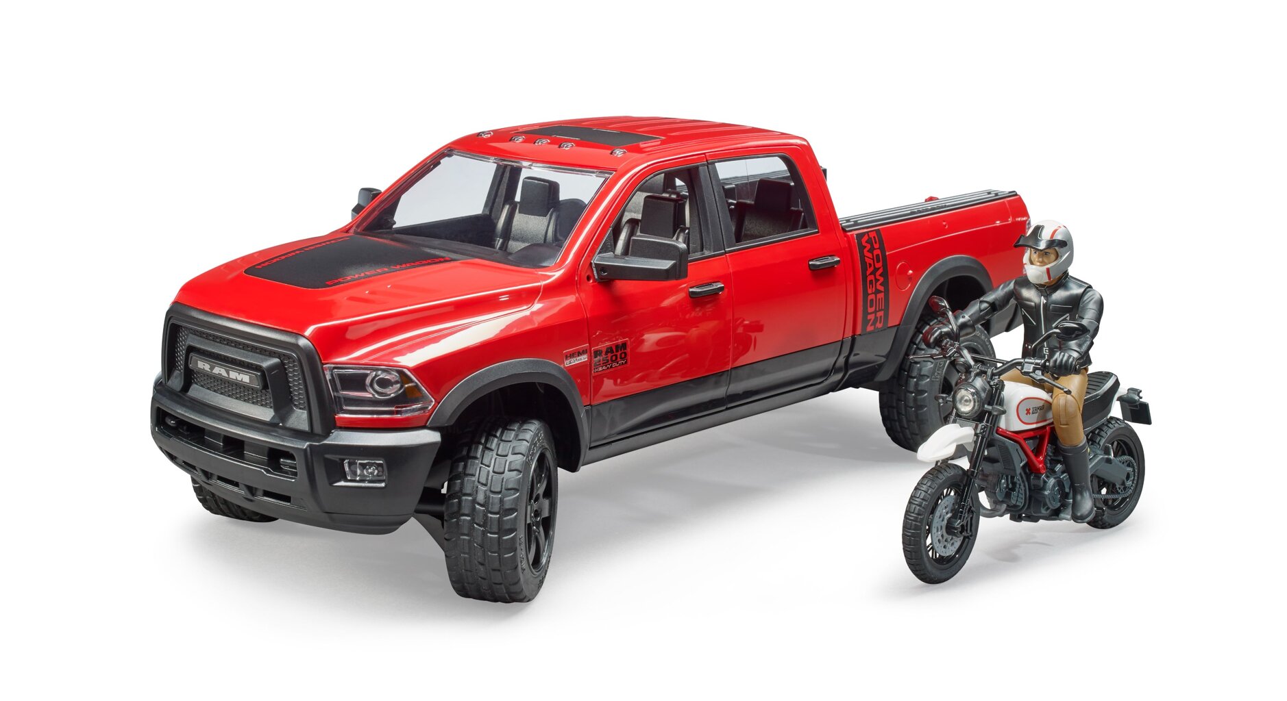 Deze aantrekkelijke combinatie van een RAM-terreinwagen en een Ducati Desert Sled-motorfiets breidt het Bruder-modellengamma uit.