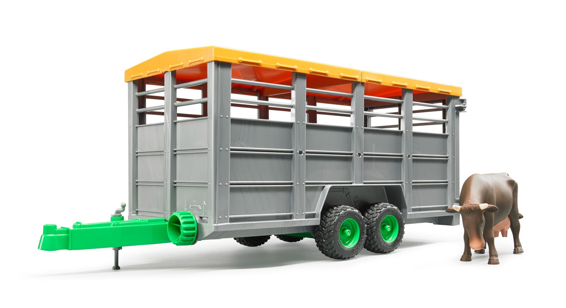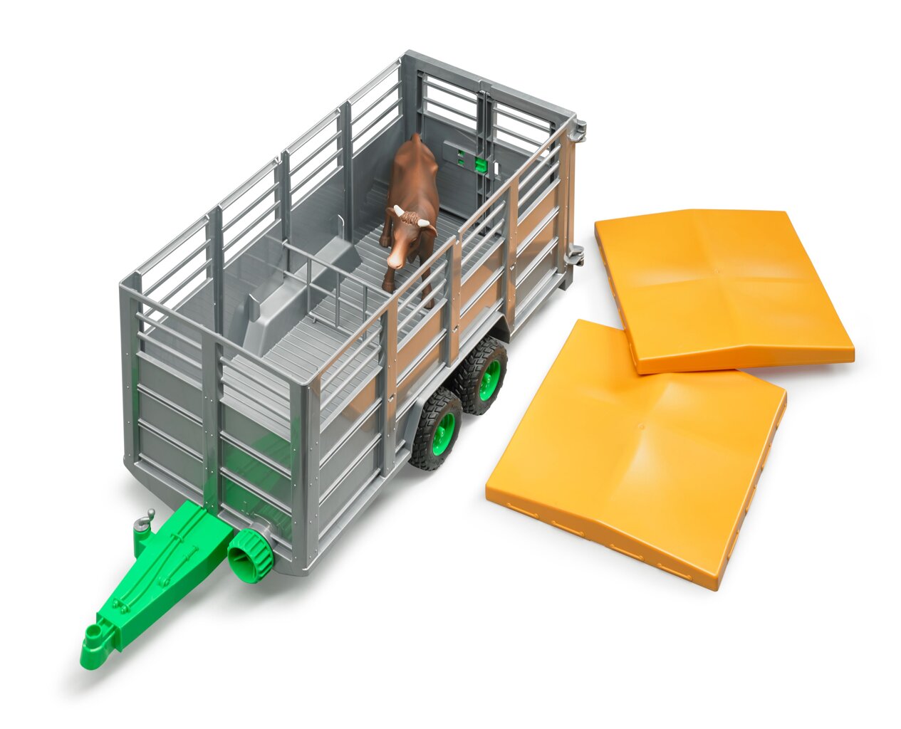 Het ideale transportmiddel om vee van de boerderij van uw kleine boer naar de weide te verplaatsen. De deur kan eenvoudig worden geopend om de dieren eruit te laten. Er zit al één koe in het pakket, maar de trailer biedt ruimte voor maximaal 6 dieren en kan aan alle Bruder -tractoren worden gekoppeld.