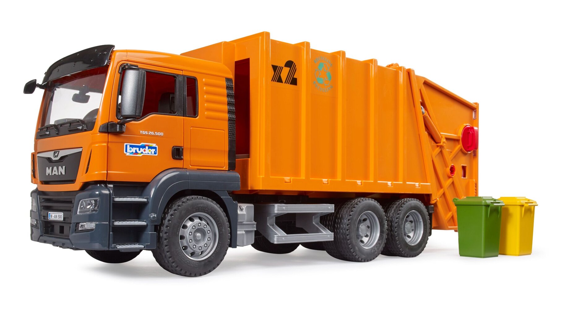 De MAN TGS vuilniswagen kan worden gecompleteerd met bijvoorbeeld de Bruder 2607 afvalset of de Bruder 62130 stadswerkerfiguur.