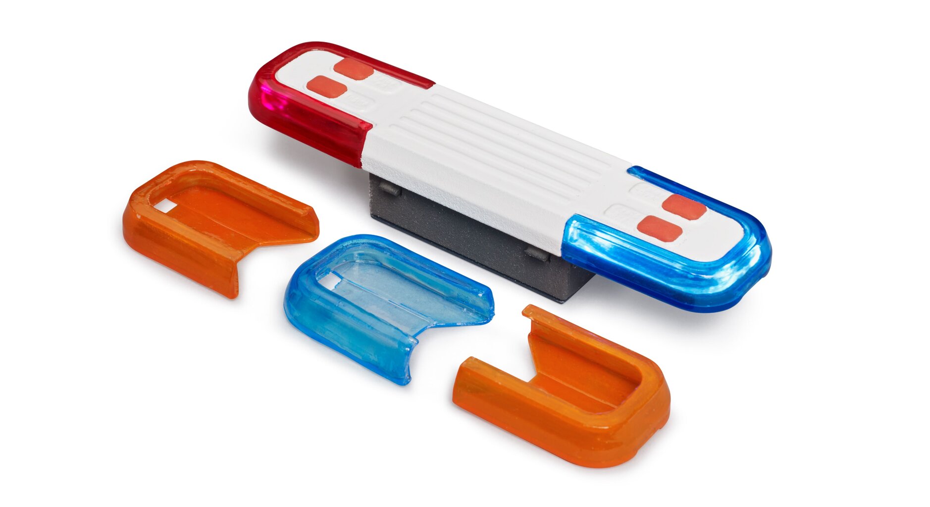 De module kan worden gecombineerd met verschillende kleuren lichtkappen - twee blauwe voor politievoertuigen, twee oranje voor dienstvoertuigen en één rode.